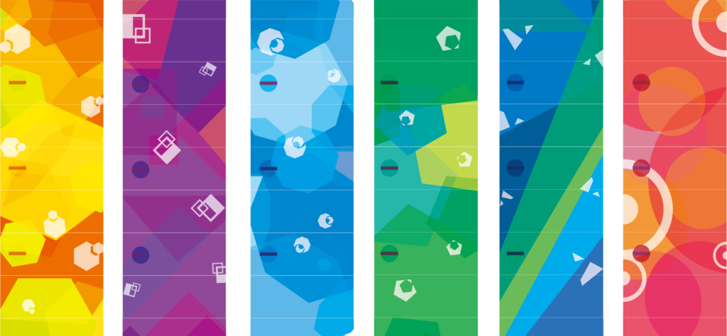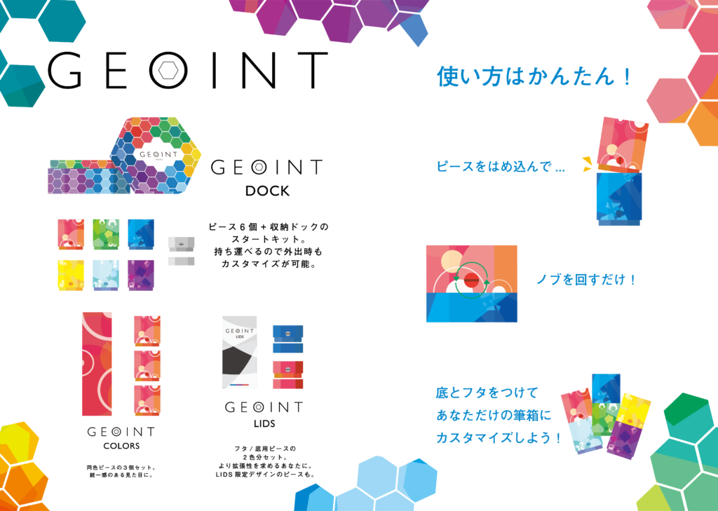 また、各色のパーツが1つずつ入ったセット商品用のパッケージはそれぞれのパッケージを六角でつなげるような表現にしました。